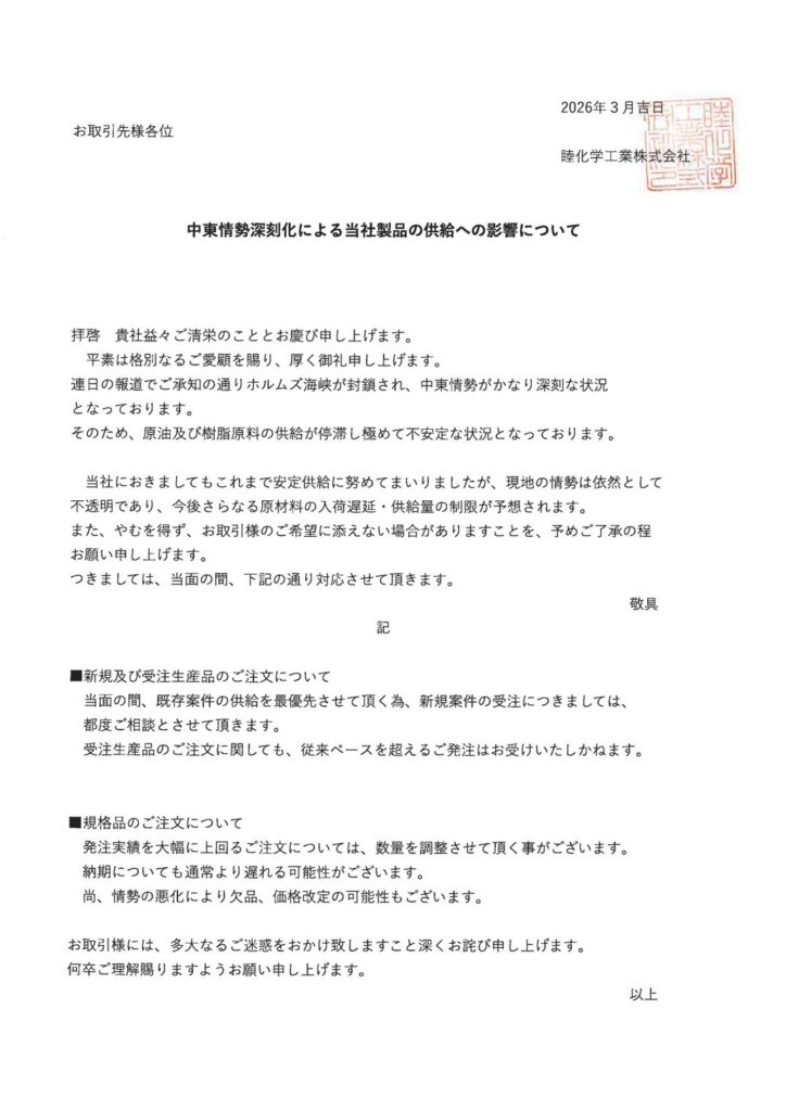 【PDFはこちら】 中東情勢深刻化による当社製品の供給への影響について